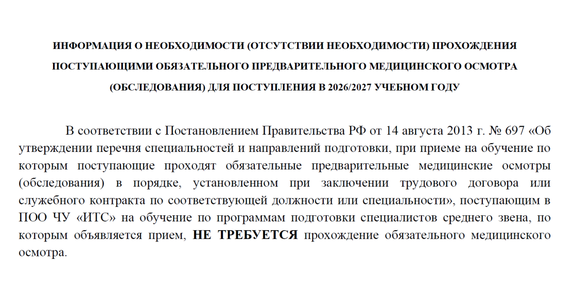 Необходимость прохождения поступающими обязательного предварительного медицинского осмотра (обследования)